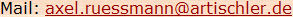 Die Verantwortung für Inhalte dieser Homepage liegt bei www.artischler.de- Axel Rüßmann. Die Weiterverwendung und/oder Vervielfältigung sämtlicher oder einzelner Inhalte sowie die Darstellung dieser Seiten in Frames bedarf einer schriftlichen Erlaubnis. Für alle Links, die zu externen Seiten führen, ist ausschließlich der jeweilige Betreiber/Webmaster verantwortlich.